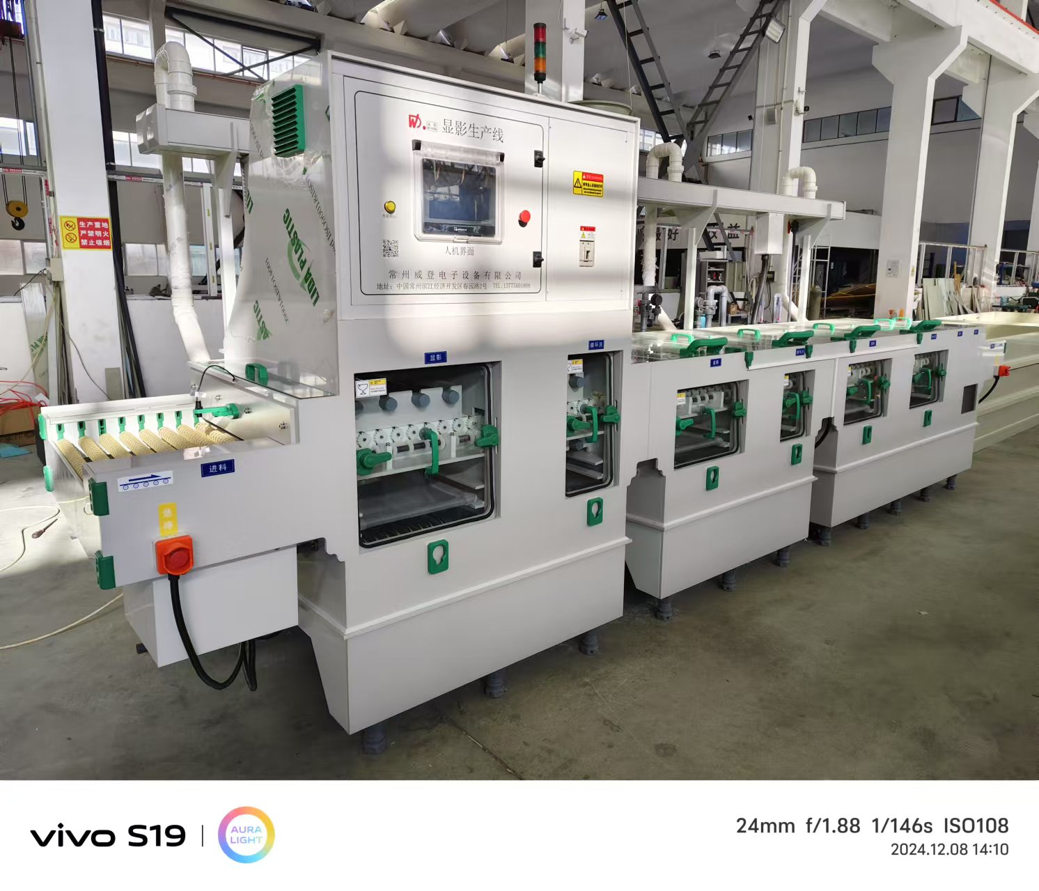 显影生产线是通过一种化学反应,将感光胶涂层的不需要保留的部分通常是镀铜层的部分腐蚀去除,留下需要保留的电路图案的过程。